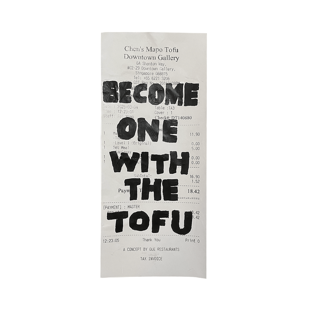 Painted on a Chen's Mapo Tofu receipt for one order of Mapo tofu. To become one with the tofu is to give up control and absorb everything life has to offer and embrace versatility.