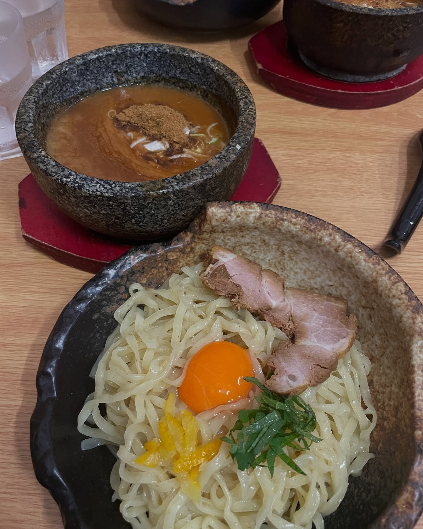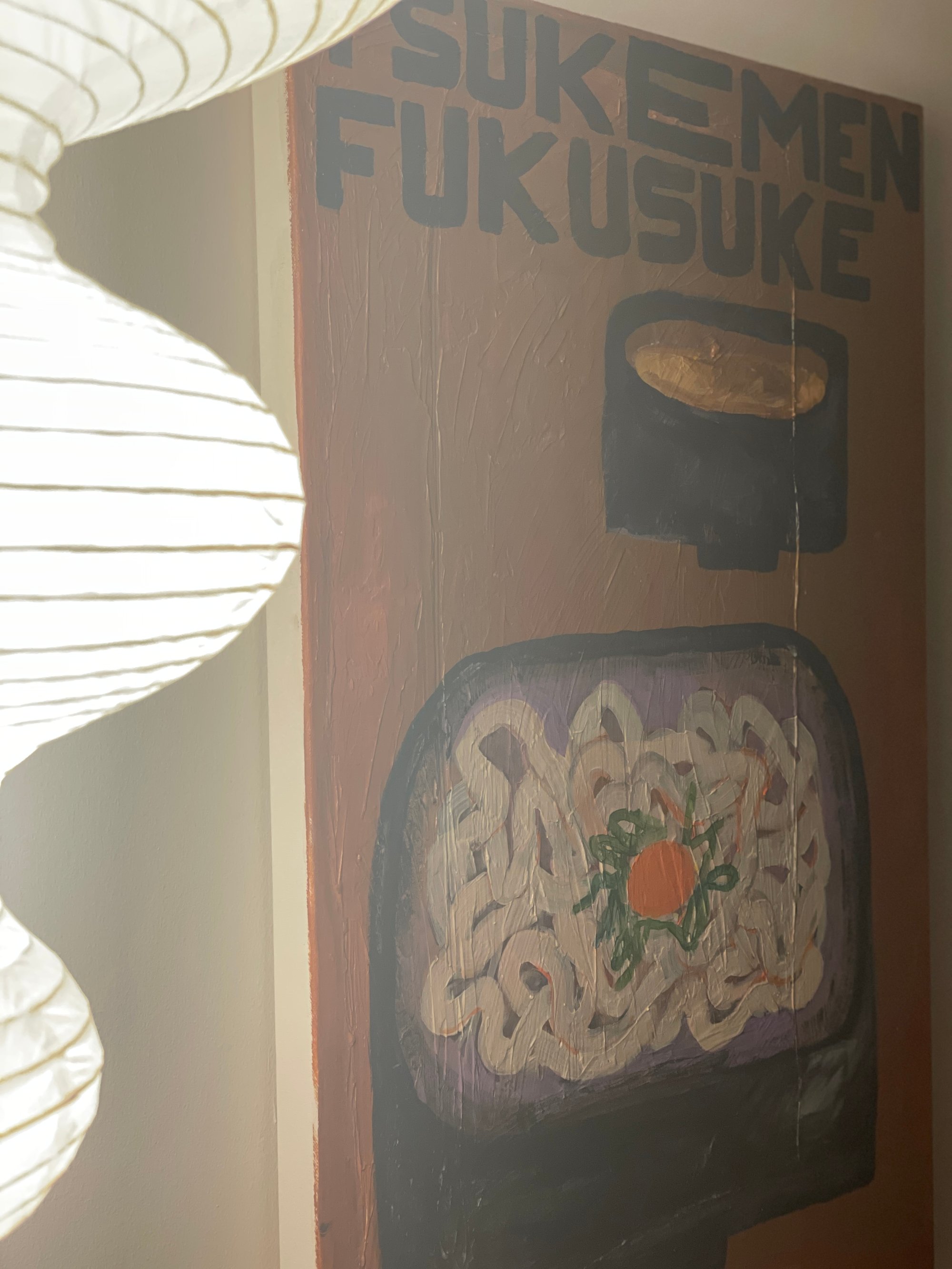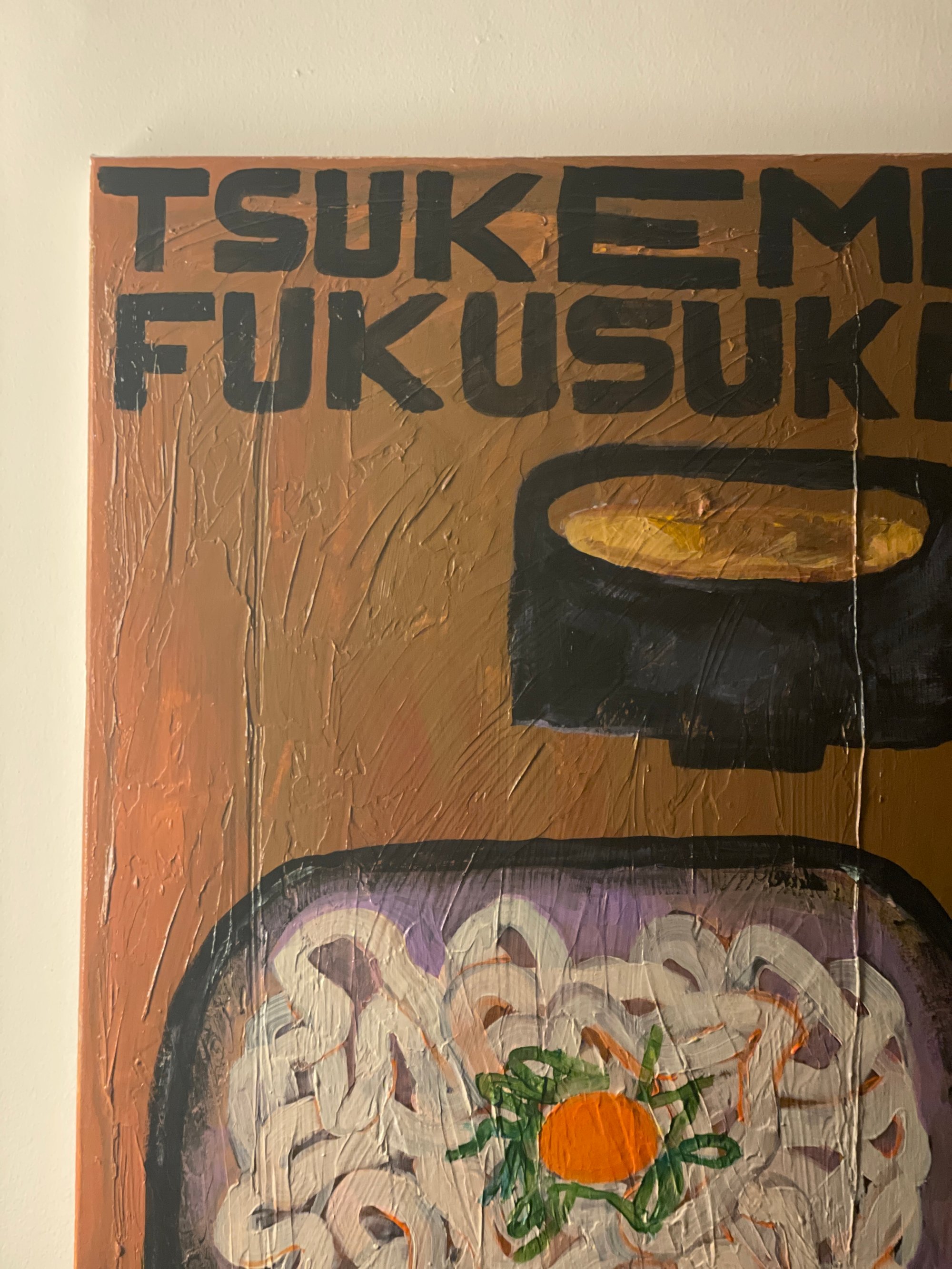 This work is inspired by the tsukemen at Fukusuke Izakaya—hands down the best I’ve had in Singapore. The dipping broth was a deep bonito richness, topped with a clean bite of a perilla leaf. The space–small, with handwritten items on a menu and retro posters—the kind of atmosphere that felt like a shortcut to 1980s Japan. Through this piece, I tried to bottle that feeling of warmth and nostalgia.
